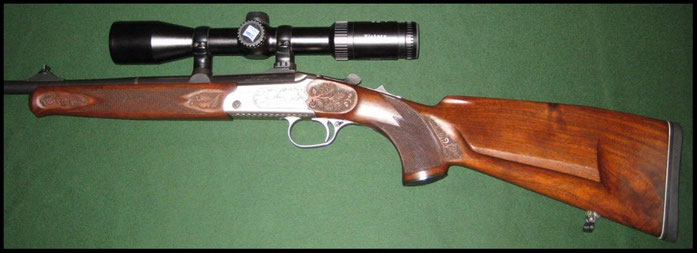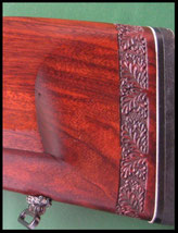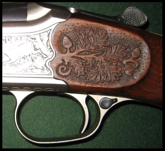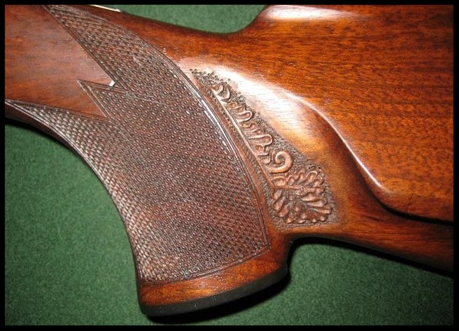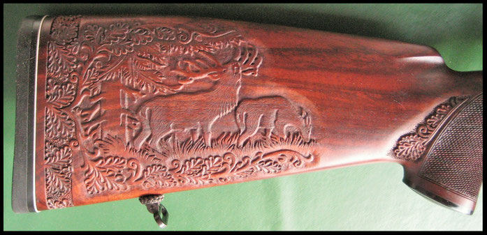 Eichenlaubornamente an Vorderschaft & Griff individuell an Schaftkontur und Fischhaut angepasst
